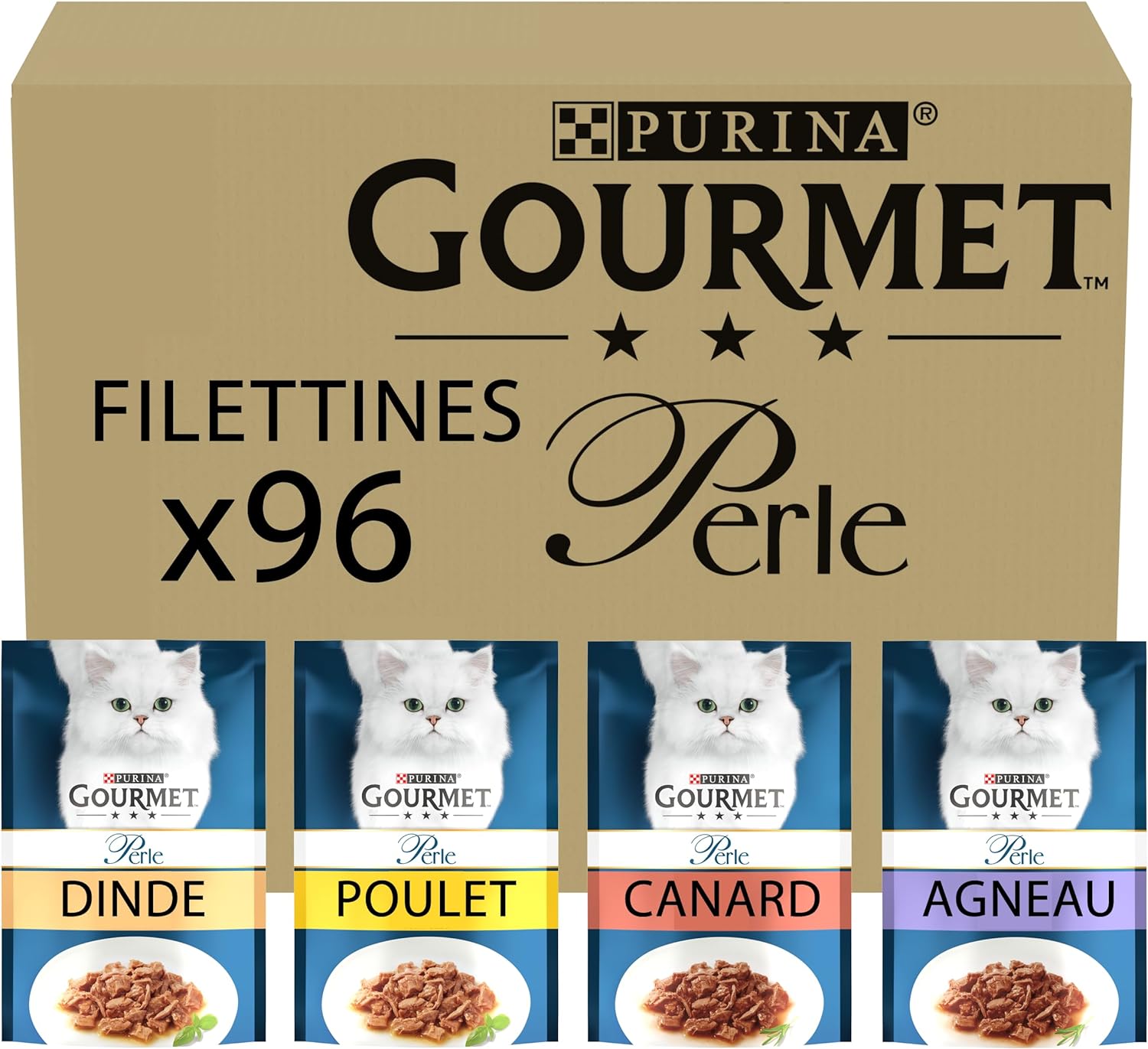 • Gourmet Perle adult wet cat food chef’s collection in gravy with Duck, Lamb, Chicken, Turkey