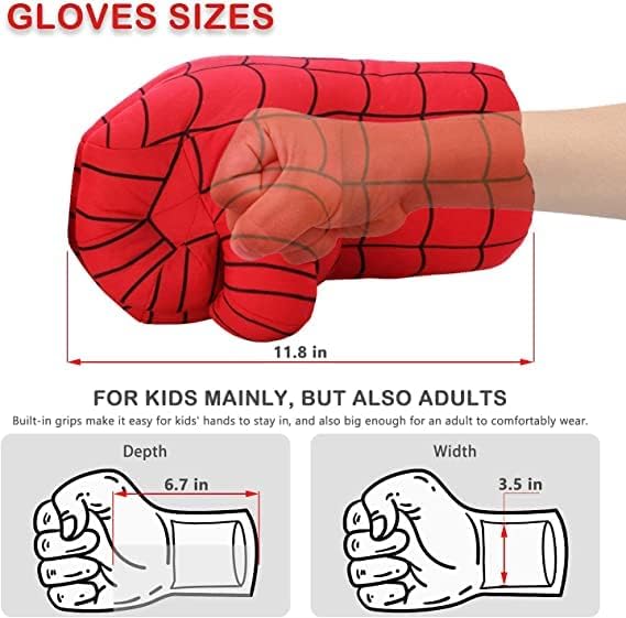 • 【For Little Spiderman Fan’s Hands Gift】The plush stuffed smash-gloves have little handles sewed inside that make it easy for little hands to stay onto, so they don’t fall off kid’s hands. Also the padded gloves are still big enough for kids age 4+ to comfortably wear.
