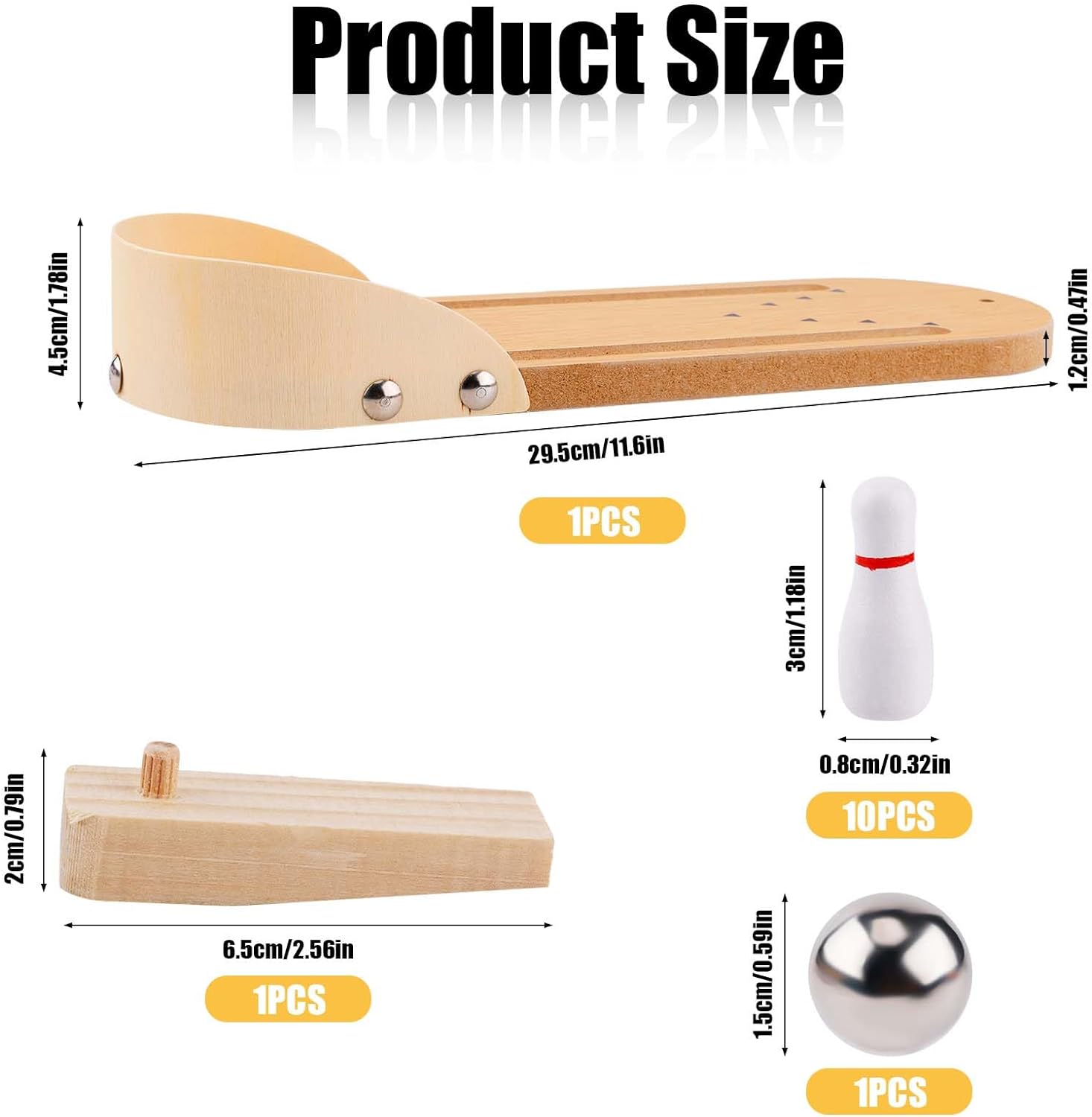 - Product Contents: You will receive 1 desktop bowling set, including 1 launch chute, wooden bowling lane with gutters, 1 metal bowling ball, 10 bowling pins. Suitable for children and adults to play.