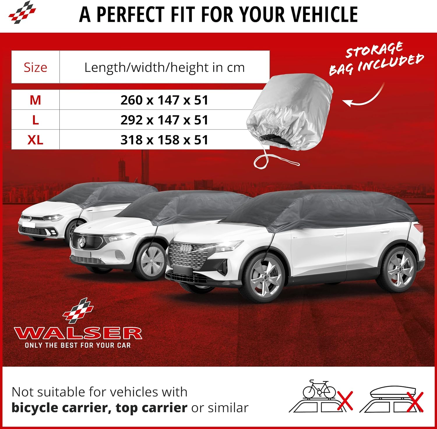 - Custom-fit car cover – The WALSER waterproof car cover is available in 16 different sizes as a car cover for cars, car cover for SUVs or van cover. The practical car covers are for winter and summer and therefore suitable for many common vehicles on the market (see information pictures on the respective dimensions and model list of the car cover).
